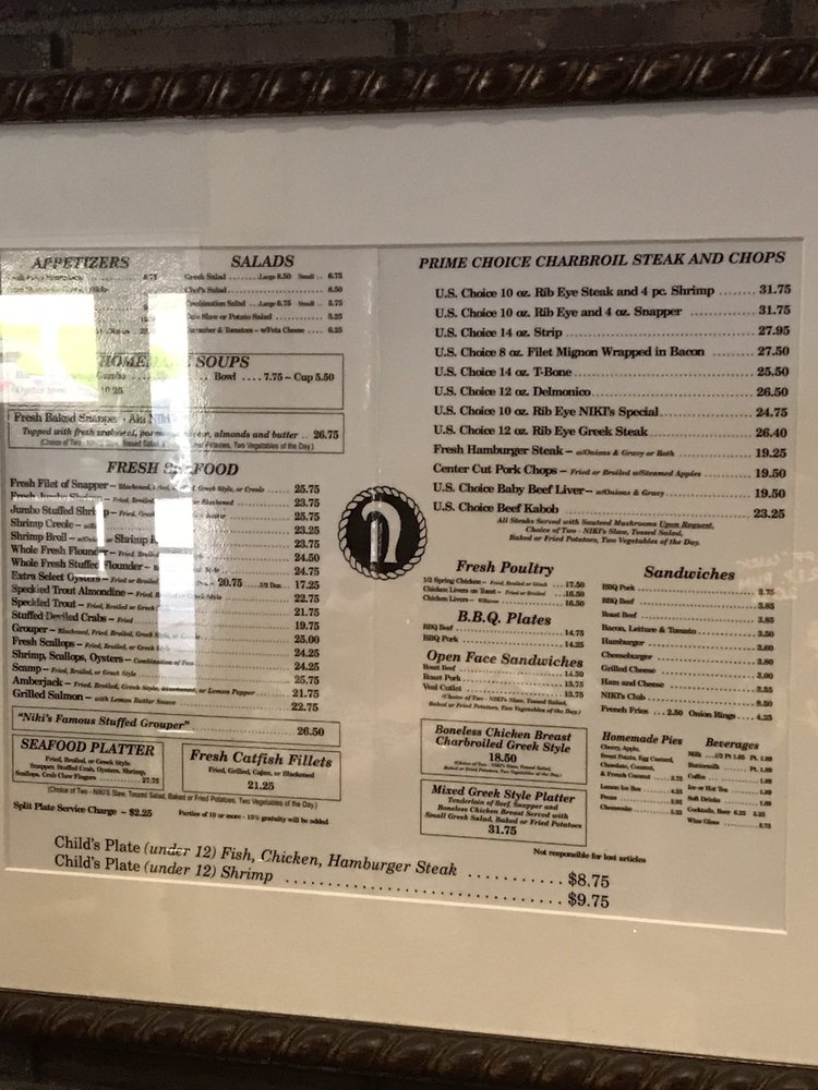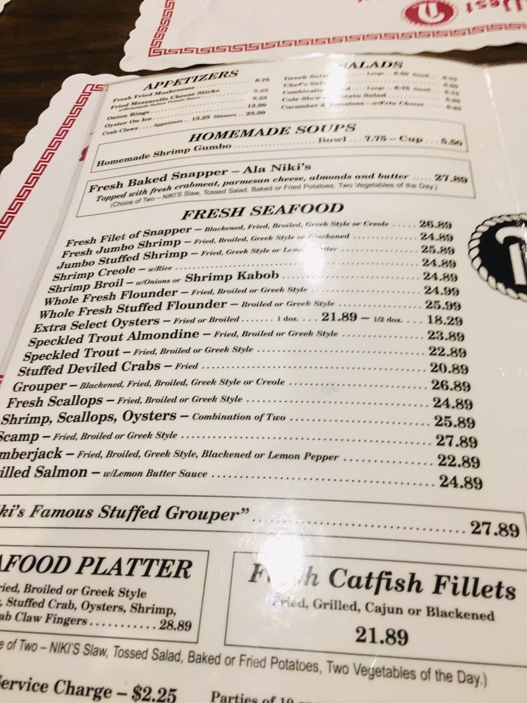 fried, broiled, or greek style snapper, stuffed crab, oysters, shrimp, scallops, crab claw fingers (choice of two - niki's slow, tossed salad, baked or fried potatoes, two vegetables of the day)